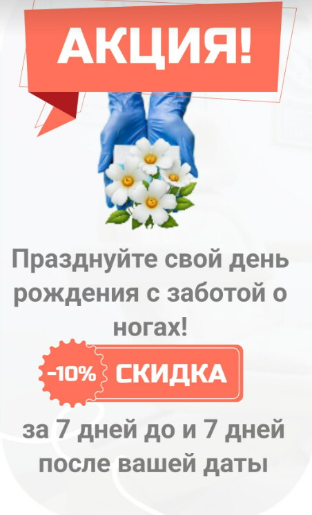 В этот Центр меня привела проблема с натоптышами на стопах. Тянул до последнего, пока уже каждый шаг не начал проносить боль и неудобство. Специалист мне хорошо обработала стопы, объяснила причину возникновения этих проблем и порекомендовала заказать специальные стельки. Я остался доволен приемом.