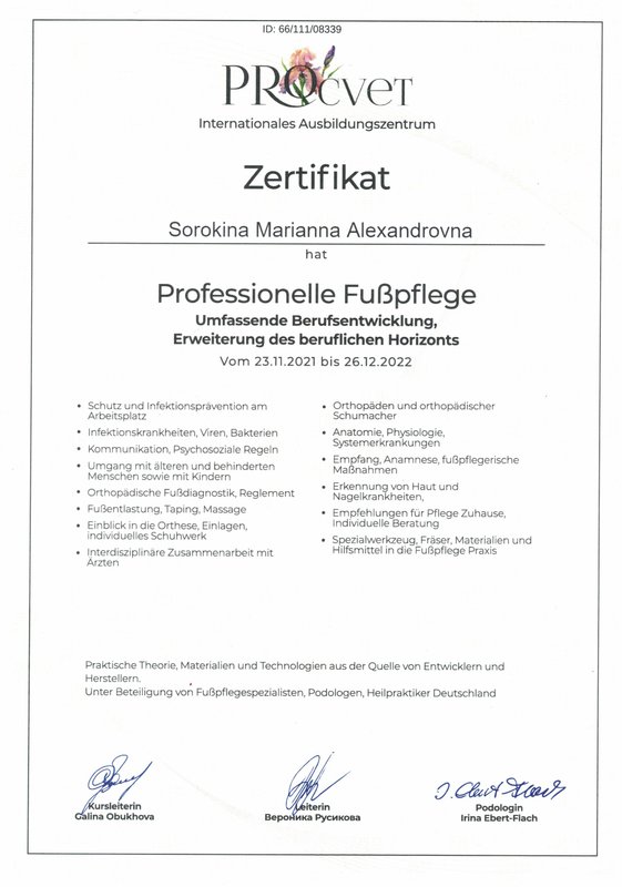 Выражаю большую благодарность центру подологии след и мастеру с большой буквы Марианне.Она делает быстро,без болезненно и от всей души. Видно что она любит свою профессию,и я буду обращаться только к ней.