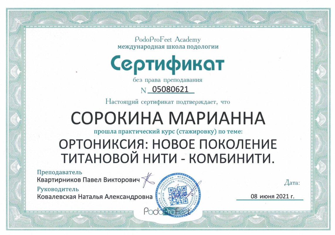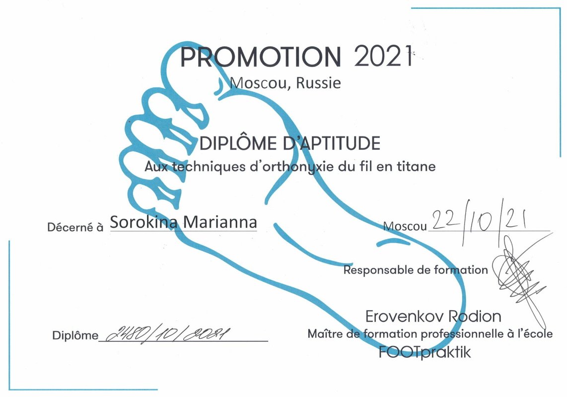 Спасибо огромное Марианне! Каждый раз только она меня спасает. Я с вросшими ногтями борюсь с с самого детства, мне исправили пластину, переодически прихожу на коррекцию ногтя, скоро придем к широкой обуви и уберем всю деформацию стопы! Марианна лучший спец в Красногорске в данной сфере, все бегом к ней!!!