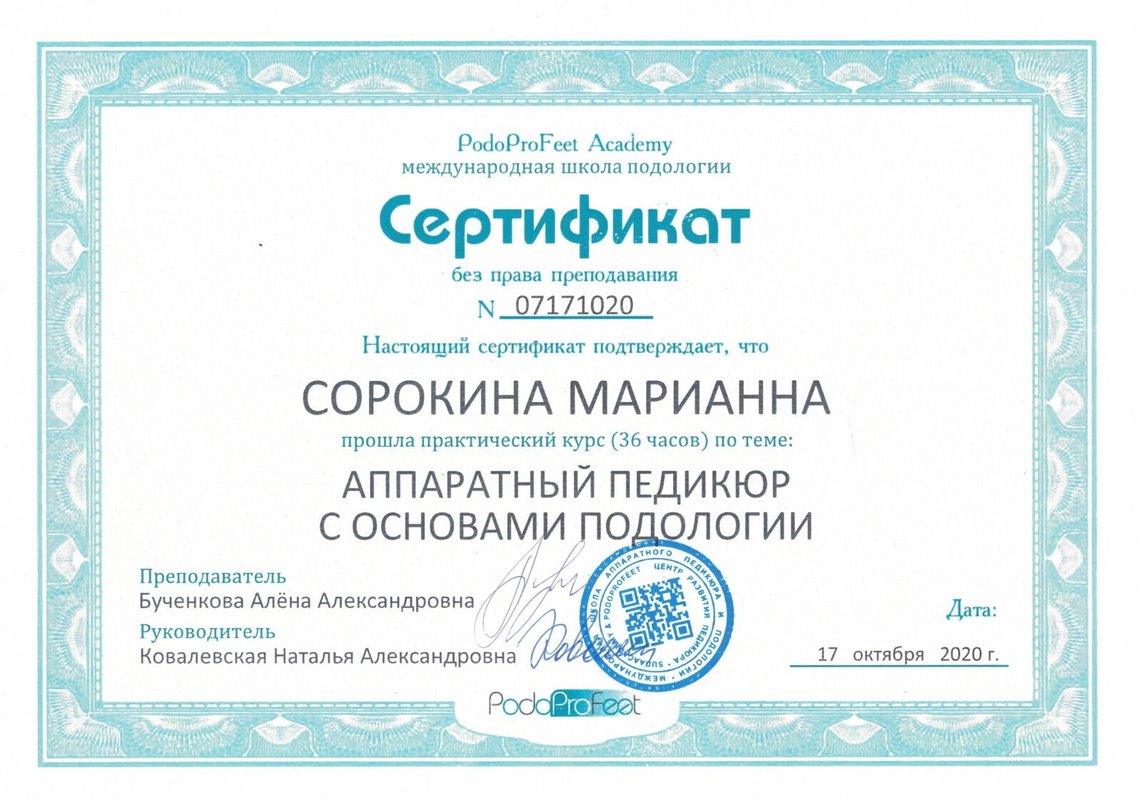 Замечательный, профессиональный подолог Марианна. Выражаю огромную благодарность за вашу работу и внимательность. Рекомендую.