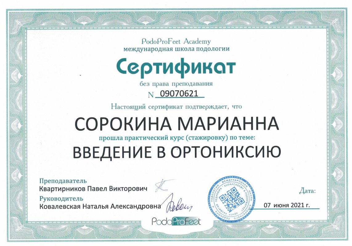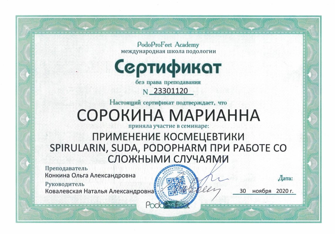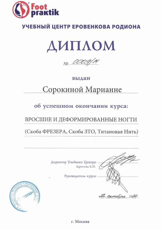 Долго искала и наконец нашла в интернете Сорокину Марианну, ранее к ней ходила в другой центр, после того как она ушла из центра (а я просила у админов ее контакты, мне не дали) , я не могла потом найти подобного специалиста, все не то. И вот наконец то я снова в руках грамотного подолога. Очень рекомендую!!!