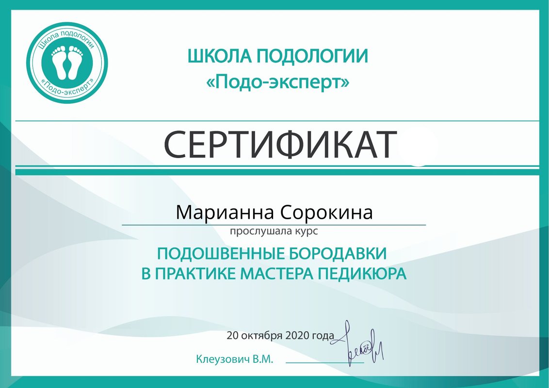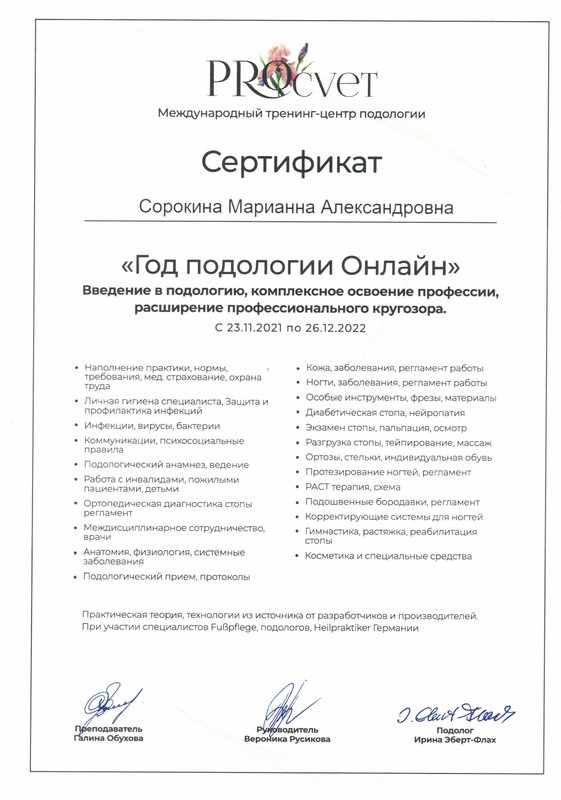Долго искал и наконец нашел в интернете Сорокину Марианну, ранее к ней ходила в другой центр, после того как она ушла из центра (а я просил у админов ее контакты, мне не дали) , я не мог потом найти подобного специалиста, все не то. И вот наконец то я снова в руках грамотного подолога. Очень рекомендую!!!